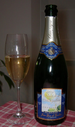 Este champagne lo compré en una tiendecilla en Reims por unos 16€, en teoría para beberlo ese mismo día de picnic por algún pintoresco paraje en los alrededores de la montaña de Reims. El caso es que el tiempo no lo permitió y hoy hemos dado cuenta de él. Se trata de un blanc de noirs del pueblo de Verzenay, con un viñedo Grand Cru casi en su totalidad. Si no recuerdo mal lo que ponía etiqueta de la tienda de Reims, se trataba de un 100% Pinot Noir, procedente de un pequeño Récoltant-manipulant llamado Jean-Yves De Carlini. He encontrado por la web mas bien poca información, por lo visto cuenta con 6.5 ha de viñedo y elabora unas 50.000 botellas. Por ese precio, bien valía la pena probarlo.