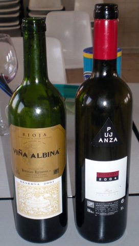De nuevo un miércoles enológico de catálisis. La semana pasada alguno de mis compañeros se sorprendió de que hubiese vinos de estilo moderno. Esto me dio la idea para el tema de esta semana. El presupuesto, unos 25€ para los dos vinos. Vi que el Viña Albina reserva estaba a 8.60€ y pensé dedicar mas presupuesto al de estilo moderno, ya que normalmente suele andar mas subidos de precio. Finca Allende, Artadi Viñas de Gaín y Pujanza fueron las opciones, al final me decanté por el Pujanza, que no lo conocía todavía. Un vino elaborado 100% tempranillo, fermentación en Inox. y maloláctica parcialmente en barrica, que sufre luego una posterior crianza de unos 14 meses en barrica de roble francés nuevo. Con 14% de alcohol, cumple bastante bien la receta de los vinos modernos. Contrastará con el Albina, que usa roble americano no nuevo, aunque muchos mas meses y con un alcohol mas comedido. Quizá fue darle ventaja al moderno, pero dado que muchos conocen mis gustos, prefería que fuese así, para no ser tachado de manipulador. Los vinos los serví tapados y pasé una pequeña encuesta antes de decir yo nada, para ver como responde un público con ninguna influencia de los críticos internacionales ante ambos estilos.